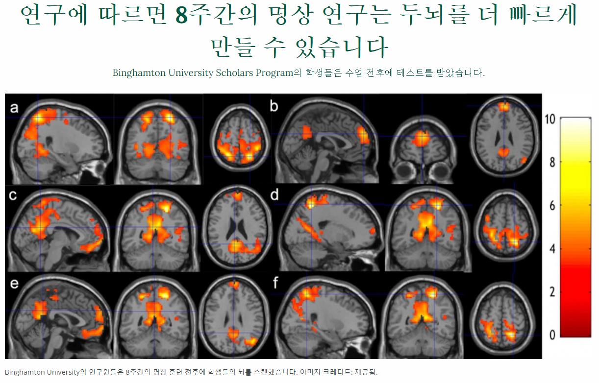 명상을 하는 동안에는 뇌의 활동성이 매우 줄어들지만, 주의 집중과 관련된 뇌 부분과 자율신경계 활동을 조정하는 뇌 부위의 활동성이 높아졌다고 합니다.