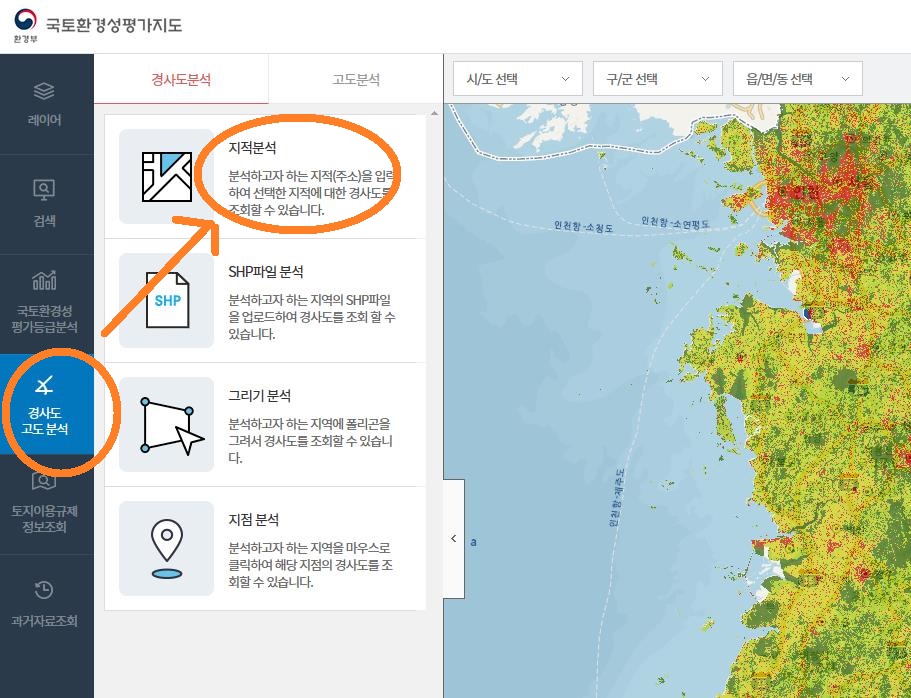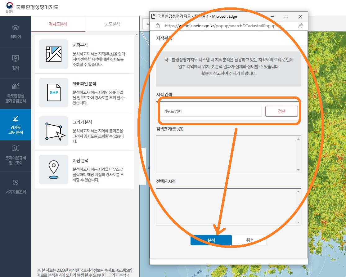 위 그림에서 먼저 경사도 고도 분석을 클릭하고, 지적분석을 다시 클릭합니다.