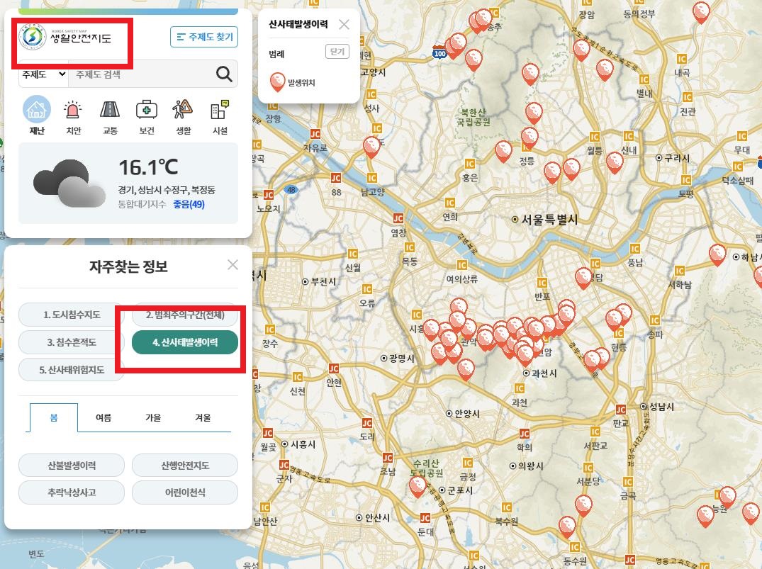 행정안정부에서 운영하는 생활안전정보 사이트에는 각종 재해지역을 찾을 수 있습니다