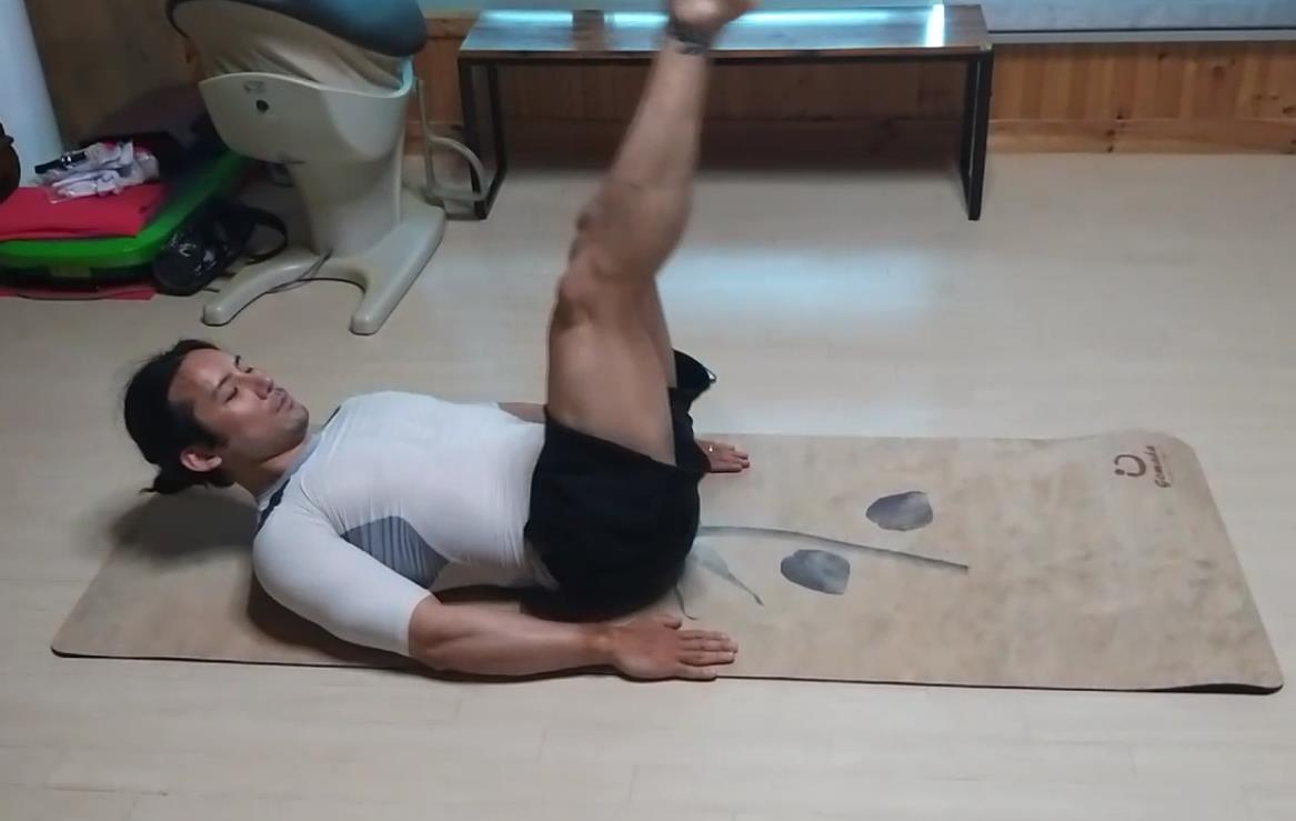 두 다리를 동시에 올리는 것은 복부근력을 더욱 강화하고 유산소 운동도 함께 됩니다.