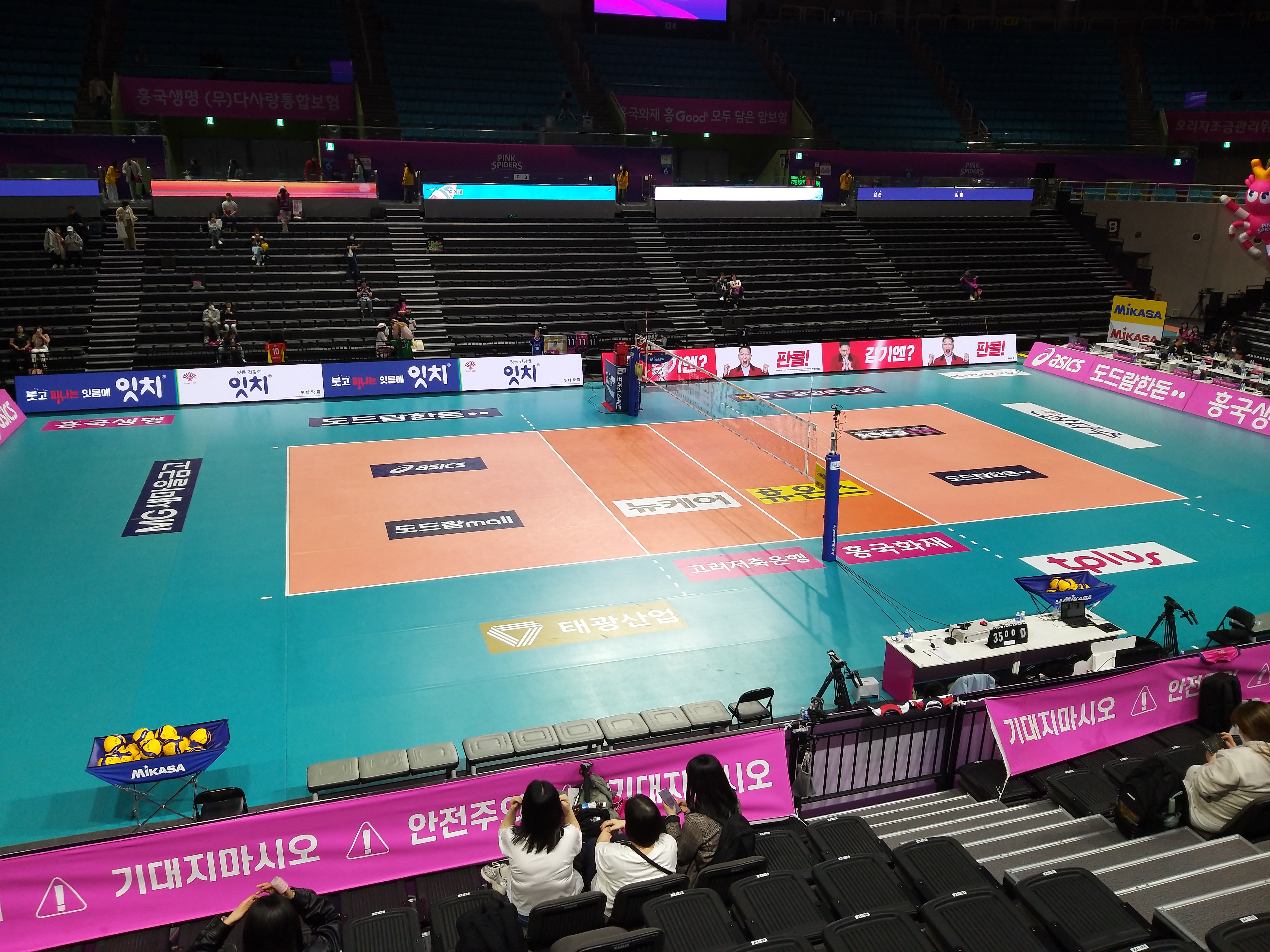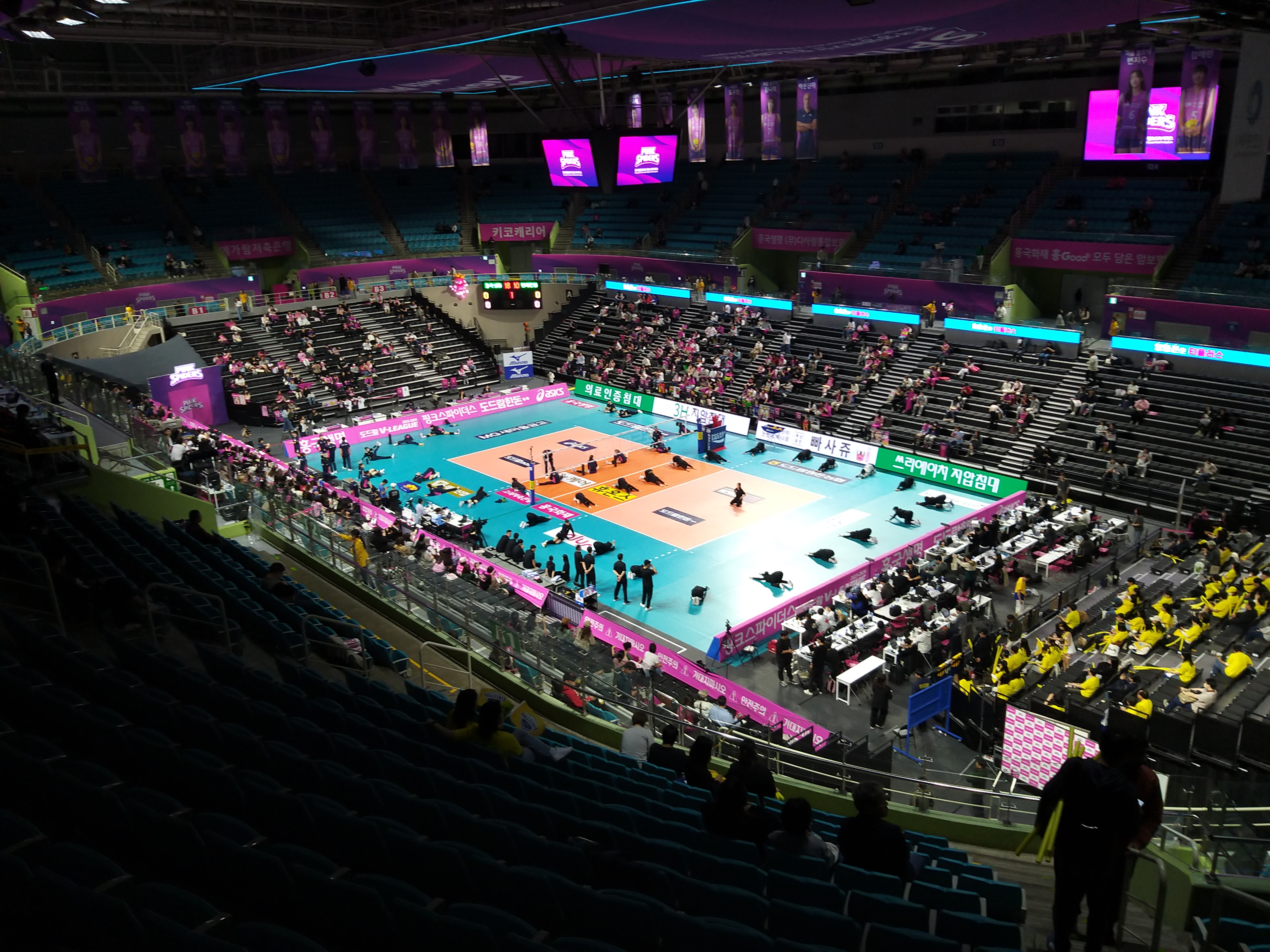 경기장 전체를 시원하게 볼 수 있는 장점이 있습니다. 또 배구코트 중앙이나, 곳곳에 비디오 화면이 있어서