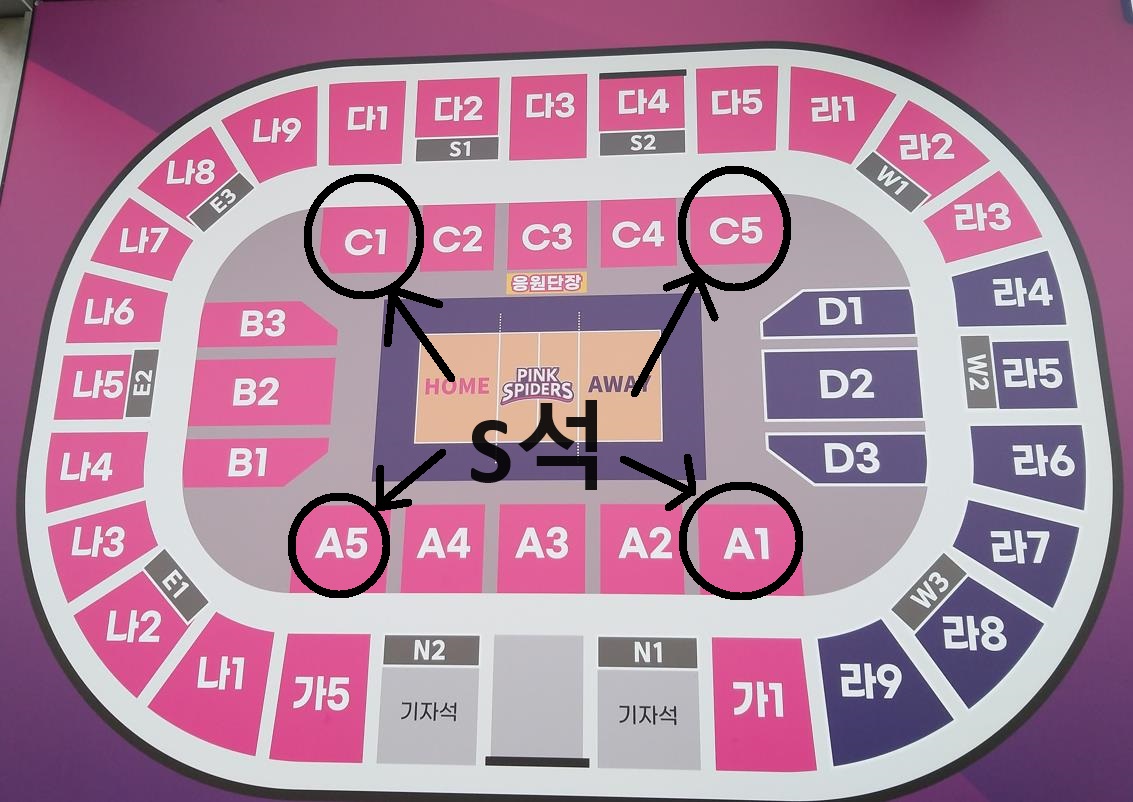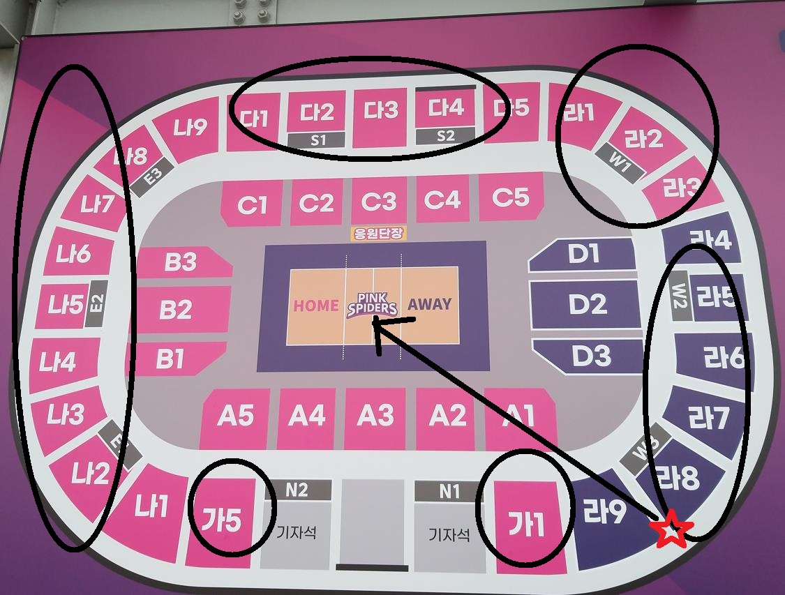 2층 가1, 가5 / 나1~나9/ 다1~ 다5/ 라1~라3 까지는 홈팀 흥국생명 배구단 응원석입니다.