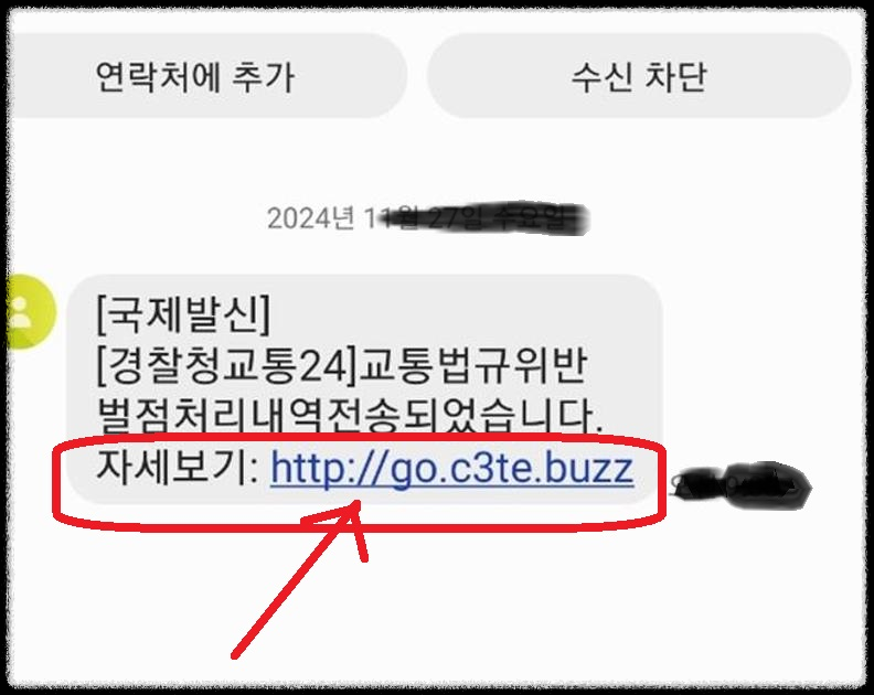 실제 피싱 단속 알림 문자에는 아래 사진처럼 보여집니다.